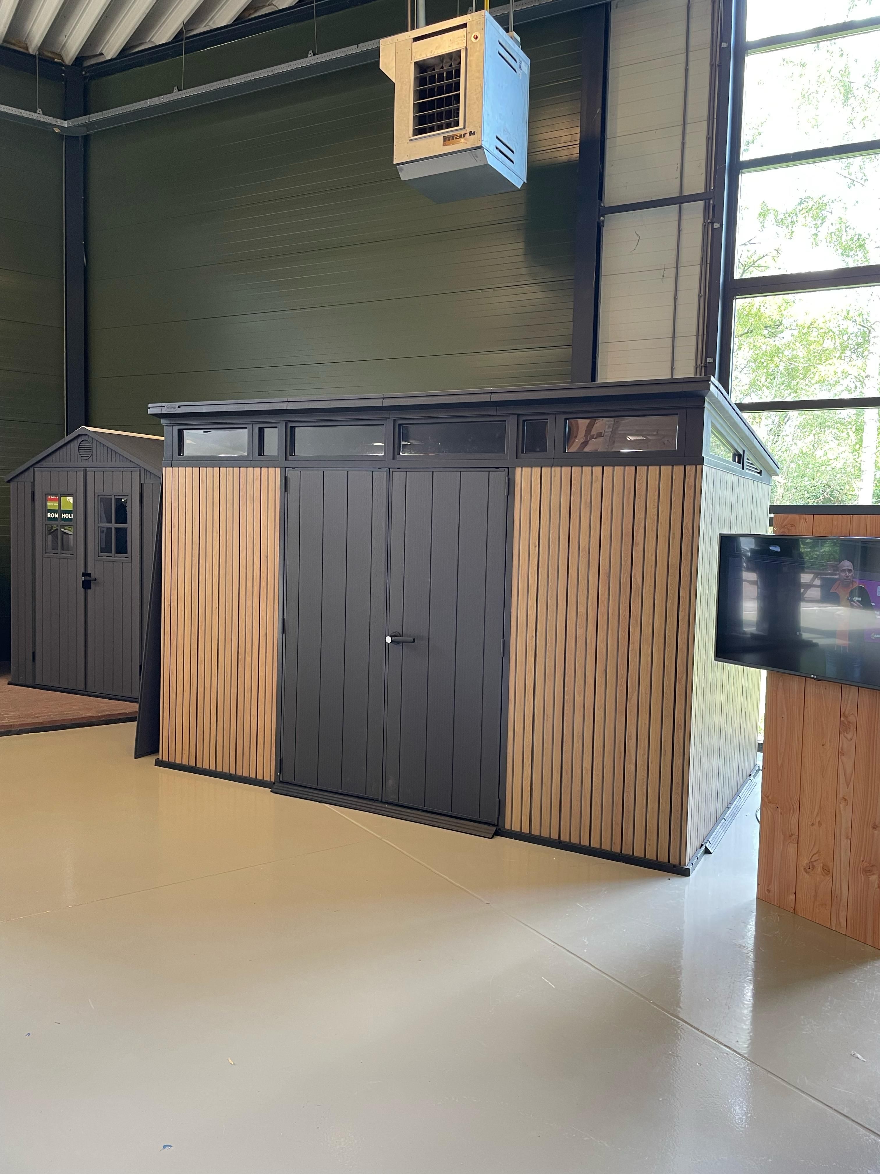 Een stevig fmetalen tuinhuis van het merk Biohort.